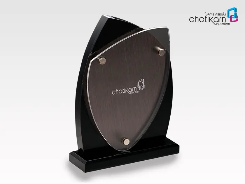 แผ่นพลาสติกอะคริลิกใสหรือสี (PMMA) ที่มีความแข็งแรง ทนทาน และน้ำหนักเบา นำมาตัดด้วยเครื่องเลเซอร์/CNC ดัด หรือหล่อขึ้นรูปเป็นโล่รางวัลหรือของที่ระลึก มีจุดเด่นคือผลิตได้รวดเร็ว ออกแบบได้หลากหลายรูปแบบ ราคาประหยัดกว่าคริสตัล ทนต่อแรงกระแทกได้ดี และสามารถสกรีนสีหรือแกะสลักข้อความได้สวยงาม