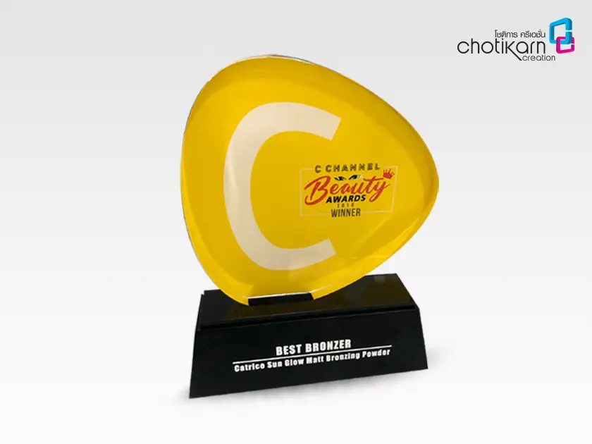 โล่รางวัลอะคริลิค (Acrylic Trophy) สำหรับงานมอบรางวัลหรืองานเกียรติยศ สามารถทำรูปทรงได้หลากหลาย เช่น ทรงสี่เหลี่ยม, วงกลม, หยดน้ำ หรือรูปทรงอิสระอื่นๆ
