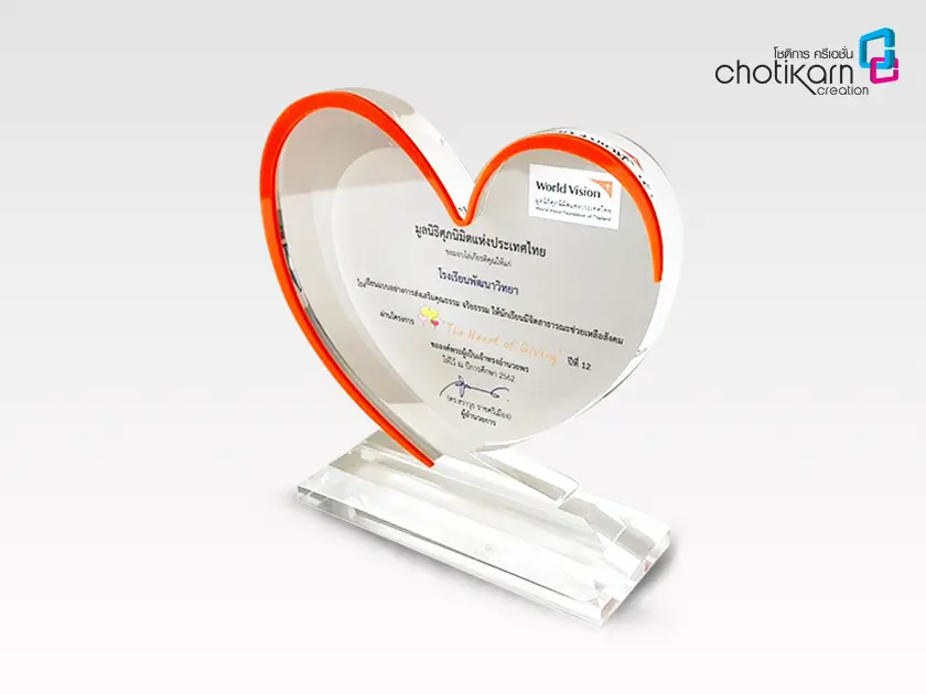 โล่รางวัลอะคริลิค (Acrylic Trophy) สำหรับงานมอบรางวัลหรืองานเกียรติยศ สามารถทำรูปทรงได้หลากหลาย เช่น ทรงสี่เหลี่ยม, วงกลม, หยดน้ำ หรือรูปทรงอิสระอื่นๆ