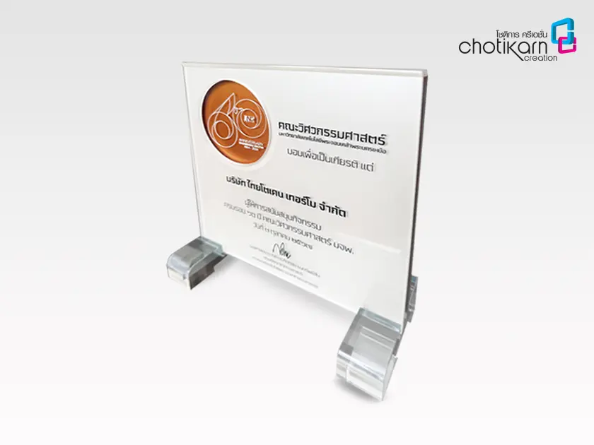 โล่รางวัลอะคริลิค (Acrylic Trophy) สำหรับงานมอบรางวัลหรืองานเกียรติยศ สามารถทำรูปทรงได้หลากหลาย เช่น ทรงสี่เหลี่ยม, วงกลม, หยดน้ำ หรือรูปทรงอิสระอื่นๆ