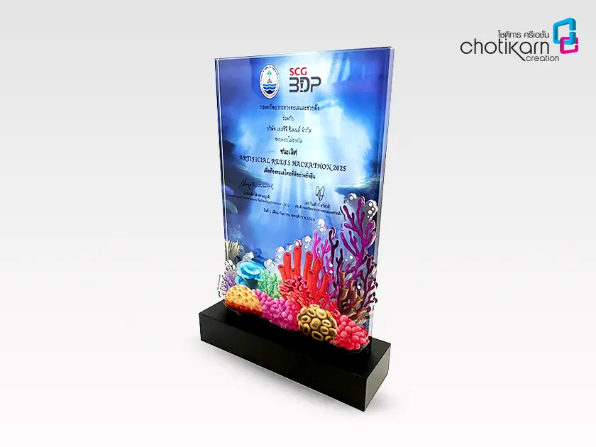 โล่รางวัลอะคริลิค (Acrylic Trophy) สำหรับงานมอบรางวัลหรืองานเกียรติยศ สามารถทำรูปทรงได้หลากหลาย เช่น ทรงสี่เหลี่ยม, วงกลม, หยดน้ำ หรือรูปทรงอิสระอื่นๆ